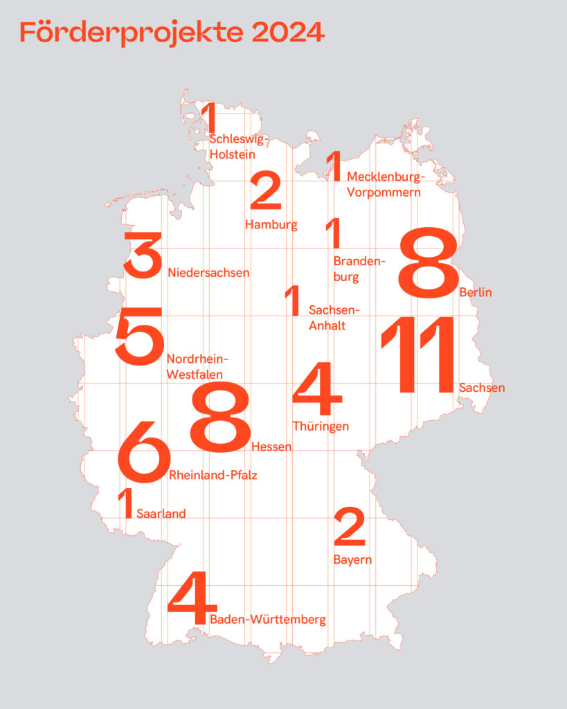Erhalten Sie eine Übersicht aller 58 geförderten Projekte des Berichtsjahres 2024 oder sammeln Sie weitere Informationen und Eindrücke zu allen aktuellen Förderprojekten.