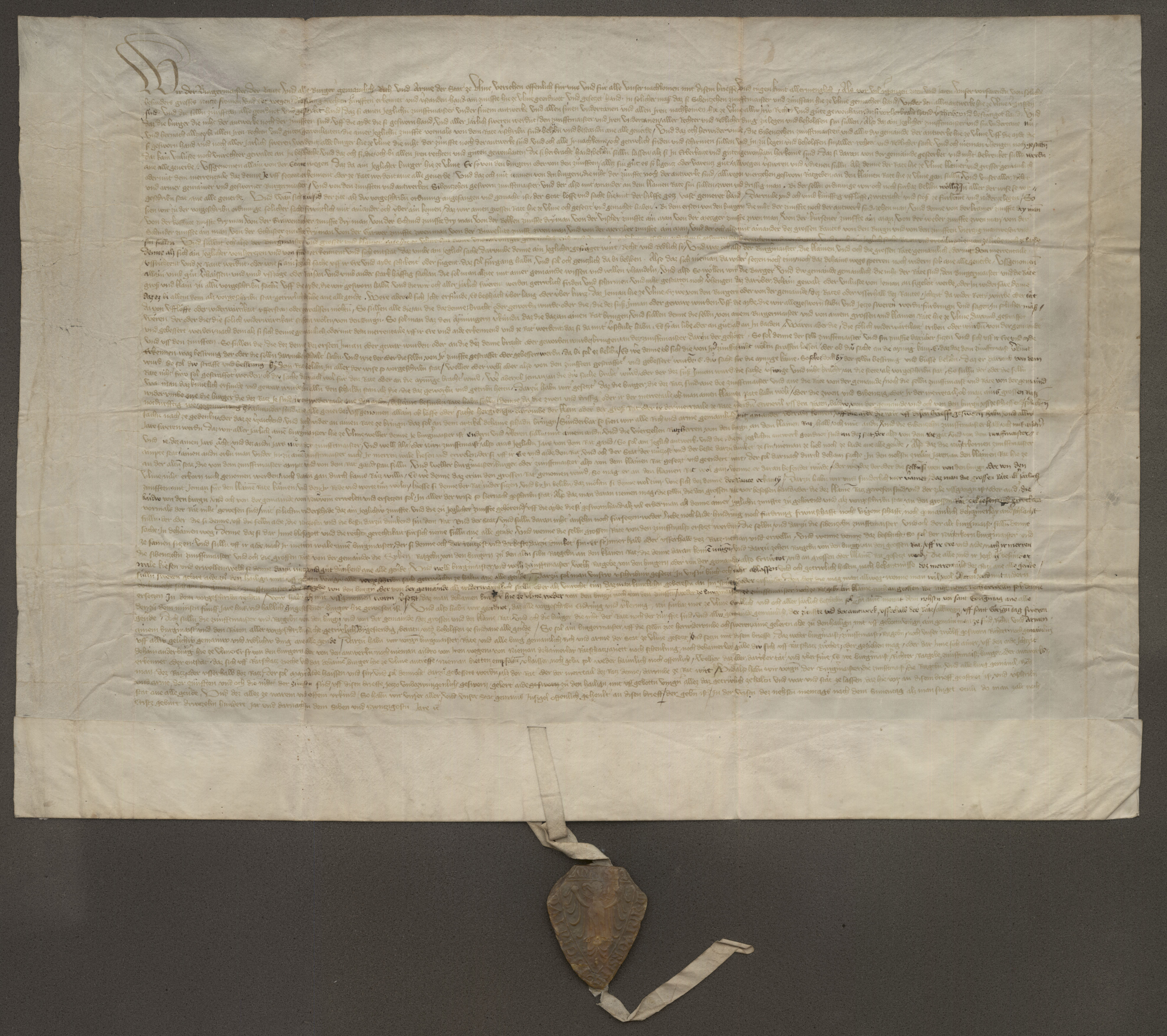 Ein erneuter Konflikt im Jahr 1396 führte zur endgültigen Festigung der Zunftherrschaft. Der „Große Schwörbrief“ von 1397 sicherte ihnen eine dominante Stellung im Stadtregiment, ohne dass damit von demokratischen Strukturen im heutigen Sinne die Rede sein kann. Tatsächlich waren nur 10 – 15 % der Ulmer Bevölkerung an der politischen Mitbestimmung beteiligt, nämlich die in den Zünften organisierten männlichen Vollbürger. Frauen, Gesellen, Dienstpersonal, Geistliche, Juden und andere marginalisierte Gruppen waren keine „Bürger“ und deswegen ebenso ausgeschlossen wie die Einwohner des restlichen reichsstädtischen Territoriums. Trotzdem stellte der gemeinsame Schwur von Obrigkeit und Bürgerschaft eine bemerkenswerte Form kollektiver Selbstbindung dar. Der Eid war nicht nur Symbol, sondern ein rechtlich und moralisch verbindlicher Akt, der Frieden und Ordnung im Gemeinwesen sichern sollte.